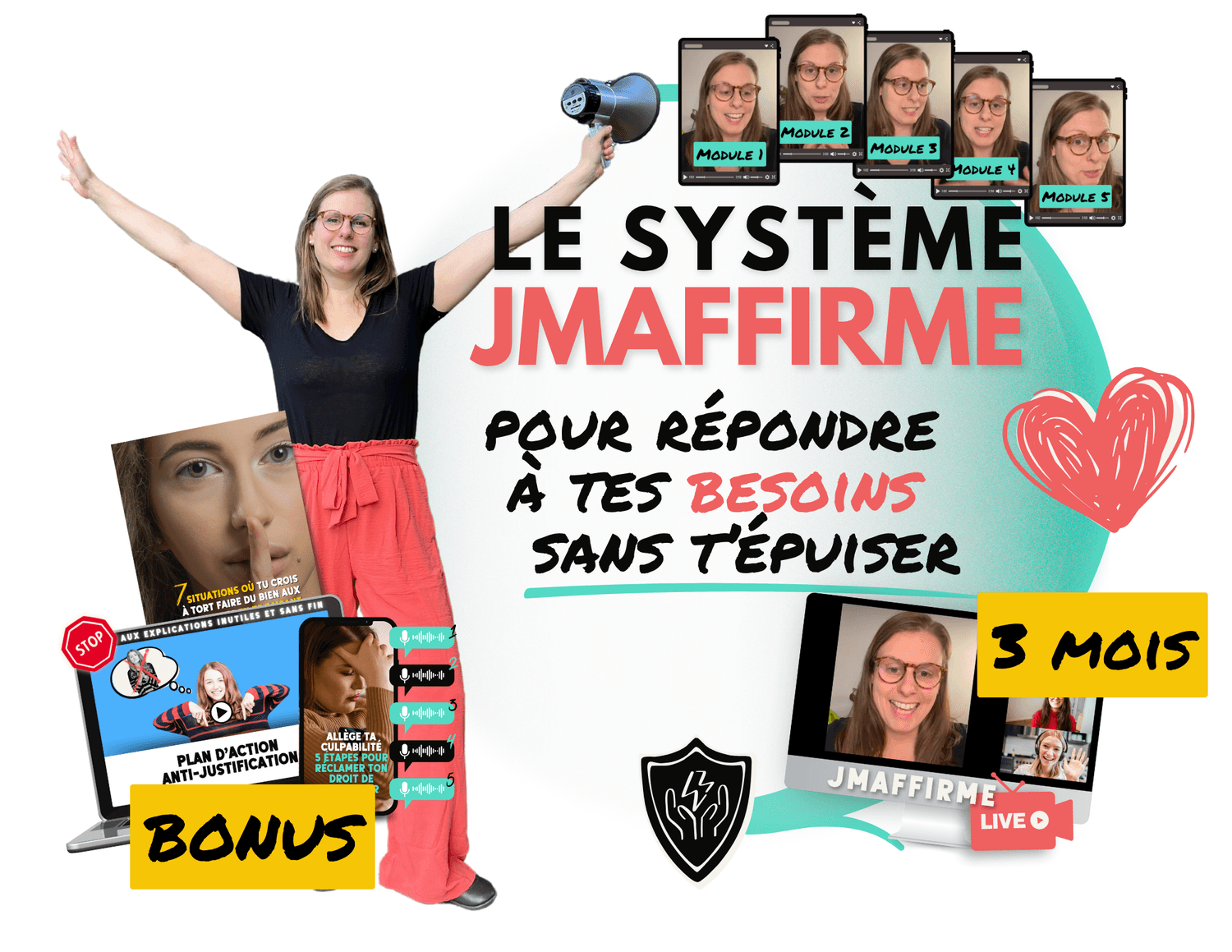 👉 5 modules pré-enregistrés : 5 vidéos exclusives où je t’accompagne pas à pas à travers le Système JMAFFIRME, pour reconnaître tes besoins, faire des choix alignés et retrouver ton énergie. Accès illimité. (Valeur de 99$)