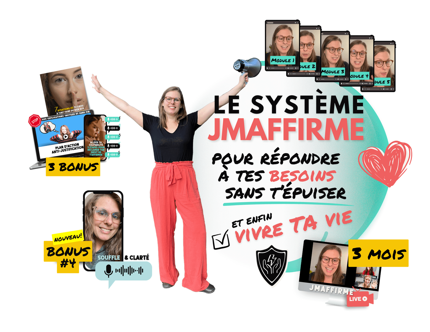 👉 5 modules pré-enregistrés : 5 vidéos exclusives où je t’accompagne pas à pas à travers le Système JMAFFIRME, pour reconnaître tes besoins, faire des choix alignés et retrouver ton énergie. Accès illimité. (Valeur de 99$)